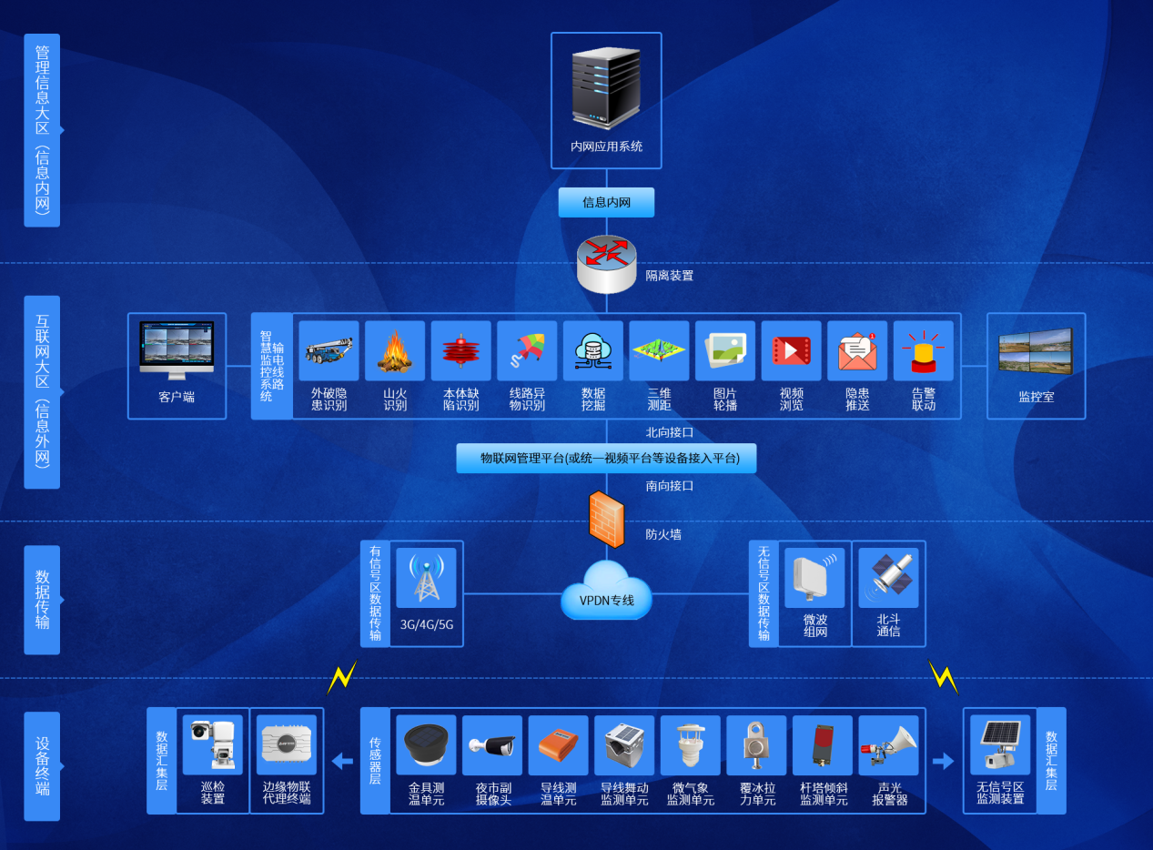 • The data of the perception layer of the transmission line is transmitted to the equipment access platform such as the "Internet of Things Management Platform" or "Unified Video Platform" through the VPN private network and the external network firewall. The device access platform data is retrieved through the northbound interface for application display, and the real-time picture can be transmitted to the information intranet through the isolation device, and the image capture instruction can be transmitted at the same time.