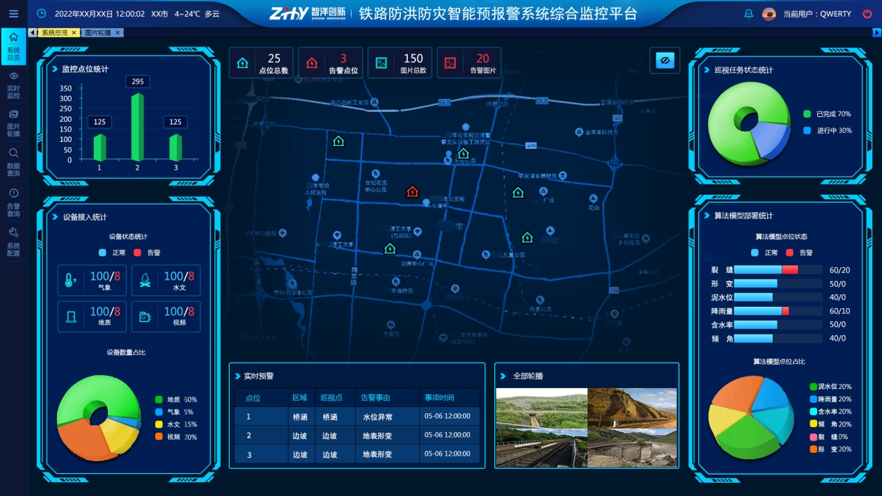 In response to the problems faced by railway flood control, such as "untimely warnings, low accuracy, insufficient disaster disposal and inspection management, and inability to manage the respective operations of multiple types of systems", the company has developed a comprehensive solution based on the flood prevention and disaster prevention intelligent warning platform. The platform is centered on the meteorological early warning system to realize the superposition of three maps of "meteorological radar map + topographic and geomorphological circle + line, bridge and culvert equipment distribution map", which is divided into meteorological early warning system, disaster monitoring system, data management system, etc. The meteorological warning, sink water warning, earthquake alarm, equipment alarm and emergency plan are combined to realize the automation and intelligence of "watching the cloud, chasing the rain, staring at the picture and knowing the water", and the flood control and disaster reduction ability of the railway department is improved, it is changed from the passive emergency to active protection, from manual alarm to automatic early warning to achieve full-scene technical support for prevention, avoidance, and repair.